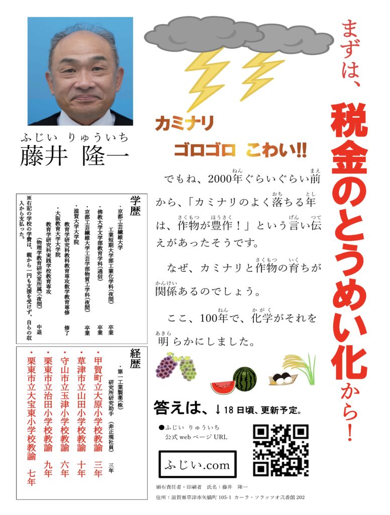 カミナリゴロゴロこわいよね でもね・・・。 2025年7月18日 更新記事 カミナリのよく落ちる季節になりました。選挙運動が始まり,掲示板の位置を確認すると,大人の往来より子どもの通学路脇にあり、子どもの往来が圧倒的に多い場所にある掲示板が散見されました。暑い中での,登下校。カミナリや作物のイラストを楽しみ、知的好奇心も喚起できたらと思い、つくり、掲示しました。 URL Copied!
